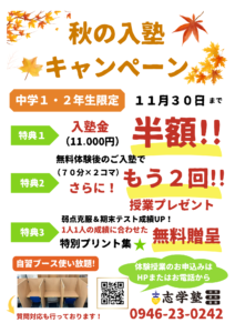 ただ今、志学塾では🍂秋の入塾キャンペーン🍁を実施しております!!